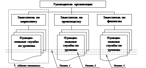 Основу линейно-функциональной структуры составляет «шахтный» принцип построения и специализация управленческого персонала по функ-циональным подсистемам организации (маркетинг, производство, исследо-вания и разработки, финансы, персонал и т. д.). По каждой подсистеме фор-мируется иерархия служб («шахта»), пронизывающая всю организацию сверху донизу (рис. 1).