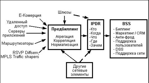 Как и в случае с коммутационными сетями, каждый элемент сети выдаёт данные в своем формате. В отличие от традиционной сети сбор данных с одного элемента не дает достаточной информации для формирования биллинговой записи. В дополнение к этому IP-адрес должен быть соотнесен с объектом биллинга и географическим размещением. Это означает, что IP-предбиллингу необходимо собрать и объединить информацию об IP-событии со всех источников. В процессе агрегации данных в первую очередь нужно отобрать ту часть данных, которая необходима биллинговой системе, и в то же время предоставить информацию, необходимую для предложения гибких тарифов и скидок. Принцип работы предбиллинговой IP- системы системы показан на рис. 2