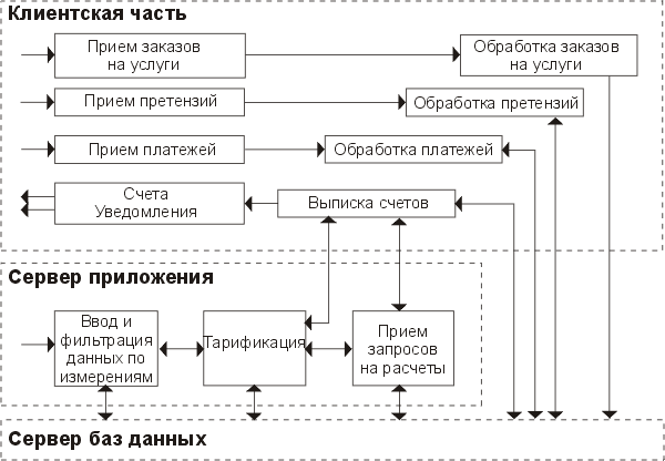 сервер приложения выделены функции расчетов по счетам: счетам за расчетный период, экспресс счетам (от начала расчетного периода по текущую дату), контрольным запросам. Кроме того, сервер приложения выполняет ввод данных измерений по использованию ресурсов и их предварительную тарификацию.