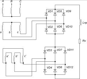 В схеме имеется 2 системы вторичных обмоток, одна включена звездой, др.- треугольником. В схеме действует 12 импульсов тока за период.