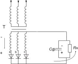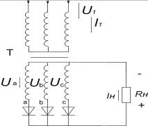 Рассмотрим особенности этого режима на примере однотактного выпрямителя для трехфазной сети переменного тока выполненной по схеме Миткевича.