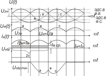 - каждая фаза в рассмотренной схеме работает 1 раз за период а импульсы тока через нагрузку вентилей совпадают по форме с действующей фазой ЭДС. Длительность импульса тока равно 2π/м где м – число импульсов тока за период выпрямляемого напряжения;