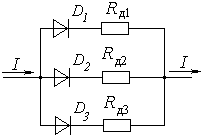 Величины токов определяются их сопротивлениями в прямом направлении. Но сопротивления диодов в прямых направлениях Rдпр даже для однотипных диодов различны. Для выравнивания токов диодов последовательно включают добавочные сопротивления. Причем Rд в 5…10 раз больше Rдпр.