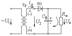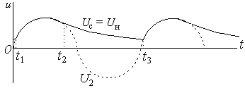 Конденсатор заряжается до напряжения U2, когда U2 > Uс (интервал t1 – t2). В течение интервала времени (t2 – t3) напряжение Uс > U2 – диод закрыт, а конденсатор разряжается через резистор Rн с постоянной времени
