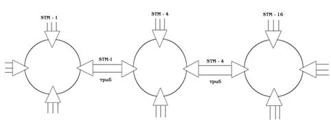 Другое часто используемое в архитектуре сетей SDH решение - соединение типа "кольцо-кольцо". Кольца в этом соединении могут быть либо одинакового, либо разного уровней иерархии SDH. На рис.2.2 показана схема соединения двух колец одного уровня - STM-4, а на рис.3.13 каскадная схема соединения трёх колец - STM-1, STM-4, STM-16.
