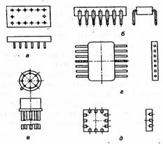 Велике значення для підвищення надійності ІМС і мікроелектронної апаратури має стандартизація конструкції корпусів. Державний стандарт визначає вимоги до форм і розмірів корпусів та мікросхем. Використовують корпуси п’яти форм. Корпус першого типу має прямокутну форму з виводами, перпендикулярними до площини їх кріплення (Рис 2.5, а), корпус другого типу – прямокутну форму з прямокутними виводами (Рис 2.5, б), корпус третього типу – круглу форму з круглими виводами (Рис 2.5, в), корпус четвертого типу – прямокутну форму з виводами, розташованими паралельно верхній та нижній площинам (Рис 2.5, г). Корпуси п’ятого типу – це плоскі «безвивідні корпуси» (Рис 2.5, д). Електричне з’єднання ІМС, змонтованої в такому корпусі, здійснюють за допомогою металізованих контактних площинок, які розташовують по периметру корпусу.