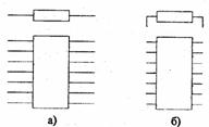 Мікросхеми в круглих і прямокутних корпусах зі штирьовими виводами встановлюють на друкованих платах, запаюючи виводи в отворах плат (Рис 2.5, а, 2.б, в). Плати, на які встановлюються корпуси з планарними виводами, не потребують в них отворів: планарні виводи зверху припаюють до контактних площинок плат (Рис 2.5, г), тому планарні виводи можна легко відпаювати під час ремонтних робіт. Мікросхеми з такими виводами можна розміщувати з обох боків друкованої плати.