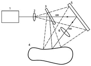 Рис.1. Принципиальная схема записи голограммы Лейта—Упатниекса: 1 — лазер, 2 — линза, 3 — полупрозрачное зеркало, 4 — объект, 5 — фотопластинка-детектор, 6 — линза в режиме лупы, ОЛ — опорный луч , ПЛ — предметный луч.