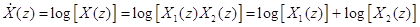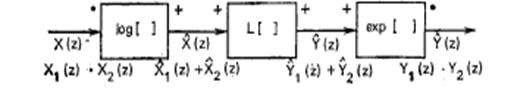 Из (5) очевидно, что z-преобразование сигнала на выходе системы должно представлять собой сумму z-преобразований компонент. Таким образом, в частотной области характеристическая система для свертки должна обладать следующим свойством: если на входе имеется произведение компонент, то на выходе должна возникнуть их сумма. Один из подходов к синтезу такой системы представлен на рис. 3.