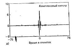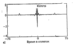 Отметим наличие пиков в положительном и отрицательном времени и быстрое затухание компонент в области малых времен, что обусловлено совместным воздействием речевого тракта, источника возбуждения и излучением. Кепстр, являющийся обратным преобразованием Фурье логарифма амплитуды модуля спектра, показан на рис.6,е. В данном случае сохранены все основные особенности комплексного кепстра, поскольку он является четной частью комплексного кепстра.