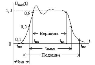 Для измерения параметров выходного импульса напомним соглашение, известное из курса электроники (см. рис. 4). Здесь введены понятия вершины и подошвы импульса. Вершина ограничена точками времени tвн (начало вершины) и tвк (конец вершины), которые определены моментами пересечения исследуемой кривой уровня 0.9Uвых,уст. Аналогичным образом по пересечениям уровня 0,1Uвых,уст определяются моменты времени tпн и tпк, определяющие длительность подошвы импульса tпш. Через эти моменты естественным образом могут быть выражены интервалы времени запаздывания tзап, длительности фронта tф, спада tсп и длительности самого импульса tи,вых.