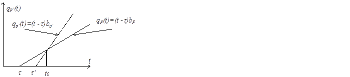Всякий раз, когда сервер готов к обслуживанию нового требования он выбирает из очереди требование с наивысшим мгновенным приоритетом- наибольшим значением приоритетной функции. Требования из класса с большим значением наращивают приоритет с большей скоростью, чем требования из низшего приоритетного класса. На рисунке 3 показан пример того, как поступившее позже требование, но из высшего приоритетного класса, может получить обслуживание раньше, чем поступившее ранее требование из менее приоритетного класса. Это произойдет, если сервер освободится позже момента t0 . При освобождении сервера до этого момента, обслуживание получит первое из поступивших требований.