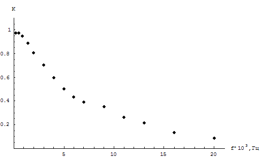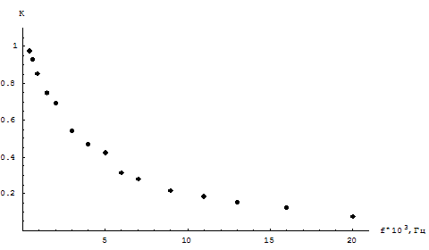 f,Гц*103 | 0,2 | 0,5 | 0,9 | 1,4 | 2 | 3 | 4 | 5 | 6 | 7 | 9 | 11 | 13 | 16 | 20 |