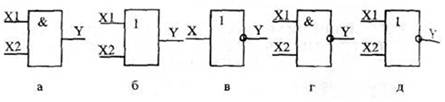 Рис.1. Умовні позначення логічних елементів одноступінчатої логіки: а)-"І" б)-"АБО" в)-"НЕ" г)-"І-НЕ" д)-"АБО-НЕ"