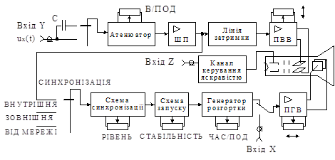 Досліджуваний сигнал ux(t) через Вхід Y подається на атенюатор або безпосередньо (відкритий вхід), або через розділювальний конденсатор С (закритий вхід). Якщо вхід відкритий, то в канал вертикального відхилення проходять як змінна, так і постійна складові сигналу. В противному разі через конденсатор С проходить тільки змінна складова сигналу. Вихідний сигнал атенюатора підсилюється широкосмуговим підсилювачем ШП і подається, по-перше, через лінію затримки і підсилювач вертикального відхилення ПВВ на вертикально відхильні пластини ЕПТ, і по-друге, - в канал горизонтального відхилення променя для синхронізації генератора розгортки.