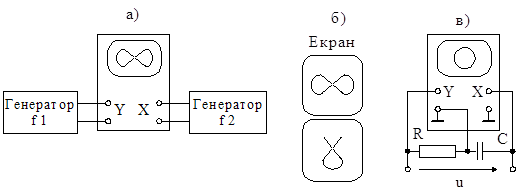 Для одержання синусоїдної розгортки генератор розгортки від’єднується і на горизонтально відхильні пластини (через Вхід X) подають синусоїдну напругу від зовнішнього генератора f2 (Рис.6.50, а). Якщо до вертикально відхильних пластин також підвести синусоїдну напругу від генератора f1, то на екрані ЕПТ з‘явиться фігура Ліссажу (Рис.6.50, б): замкнена, якщо відношення частот напруг, які підведені до відхильних пластин, є цілим числом, або незамкнена, якщо відношення частот вхідних напруг є дробовим числом.