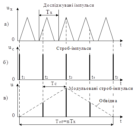Обвідна, проведена через вершини модульованих імпульсів, повторює форму досліджуваного сигналу, а її період в n разів більша ніж період досліджуваних (вхідних) імпульсів
