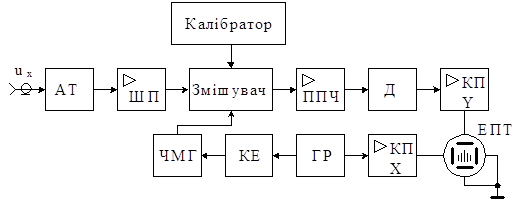 цього генератора змінюється в часі лінійно від мінімального fmin до максимального fmax значень. Напруга ЧМГ подається на один із входів змішувача, а на другий вхід змішувача через атенюатор Ат і широкосмуговий підсилювач ШП - досліджуваний сигнал ux. Оскільки змішувач є нелінійним елементом, то його вихідна напруга має складну форму, багату на гармоніки комбінованих частот