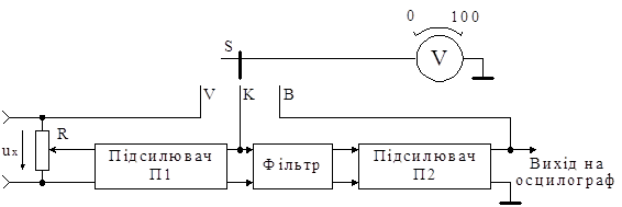 Підсилювач П1 забезпечує підсилення сигналу uх(t) до значення, зручного для відліку, а підсилювач П2 призначений для усунення впливу електронного вольтметра на настроювання фільтра і підвищення чутливості приладу.