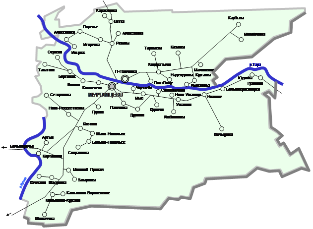 При этом Тара делит территорию Муромцевского района на две большие части. И если на правом берегу мы наблюдаем елово-сосново-березовый лес (ельников - 7 %, кедрачей – 3 %, сосняков – 18 %, березняков – 32 %, осинников – 3 %, болот – 30 %, лугов – 6 %, вод – 1 %), входящий в Западно-Сибирскую провинцию Евразийской области лесов умеренного пояса, с многочисленными болотами (крупнейшее из которых Китлинское, входит в самую обширную в мире систему Васюганских болот), озерами, множеством таежных рек (Бергамак, Инцисс, Верхняя Тунгуска, Нижняя Тунгуска), то на левом берегу это северная лесостепь – водораздельный Барабинский аллапно-болотный район (березняков - 25 %, ивняков – 9 %, болот - 60 %, лугов – 6%), входящий в Восточно-Казахстанскую провинцию Евразийской степной области.