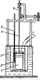Мал. – 1 калориметрична установка: 1-калориметрична бомба; 2-резервуар калориметра; 3 - двостінний захисний кожух з водою; 4 - мішалка; 5 - термометр; 6 - приводний механізм мішалки