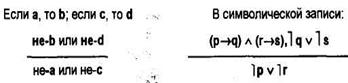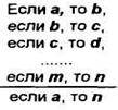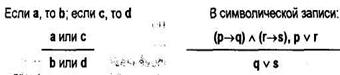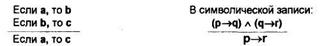 В приведенном примере обе посылки — условные суждения, причем следствие первой посылки является основанием второй (b), из которого, в свою очередь, вытекает некоторое следствие (с). Общая часть двух посылок (b) позволяет связать основание первой (а) и следствие второй (с). Поэтому заключение также выражается в форме условного суждения.