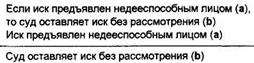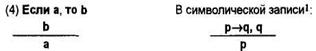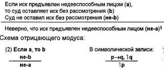 Первая посылка — условное суждение, выражающее связь основания (а) и следствия (b). Вторая посылка — категорическое суждение, в котором утверждается истинность основания (а): иск предъявлен недееспособным лицом. Признав истинность основания, мы признаем истинность следствия (b): суд оставляет иск без рассмотрения.