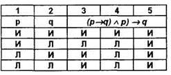 Теперь установим истинность импликации (5-й столбик таблицы — утверждающий модус). Так как импликация антецедента (4) и консеквента (2) не содержит случая, когда антецедент истинен, а консеквент ложен, то импликация всегда истинна. Следовательно, высказывание ((р→q)