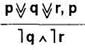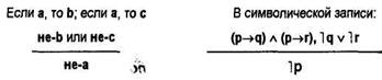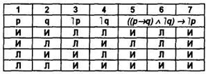 В столбиках 1 и 3, 2 и 4 показано, что если одно высказывание ложно, то его отрицание истинно. Импликация р и q (1 и 2) ложна только в одном случае (2-я строка таблицы) — столбик 5. Конъюнкция (столбик 6) высказываний (p → q) и ˉ|q (5 и 4) истинна только в одном случае (4-я строка таблицы). Импликация ((p→q)