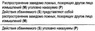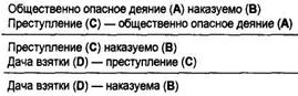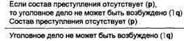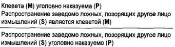 Рассмотрим для примера выделяющее условное суждение: «Если лицо виновно в совершении преступления, то оно подлежит уголовной ответственности». Нетрудно установить, что достоверное заключение получается по любому из приведенных модусов.