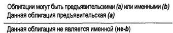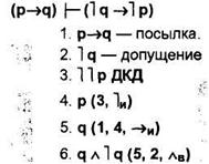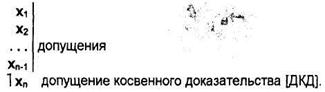 Затем по правилам вывода получаем следствия из всех имеющихся посылок и допущений до тех пор, пока ни получим две противоречащие друг другу формулы (В и ˉ|В), что свидетельствует о несовместимости допущения косвенного доказательства с другими допущениями и посылками. Отсюда делается вывод о его ложности. Тогда в вывод вписывается строка ˉ|ˉ|Xn и тем самым допущение косвенного доказательства исключается. Например, осуществим косвенный вывод: