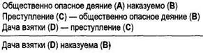Если обвиняемый виновен в заведомо незаконном аресте (а), то он подлежит уголовной ответственности за преступление против правосудия (с); если он виновен в заведомо незаконном задержании (b), то он также подлежит уголовной ответственности за преступление против правосудия (с). Обвиняемый виновен или в заведомо незаконном аресте (а), или в заведомо незаконном задержании (b)