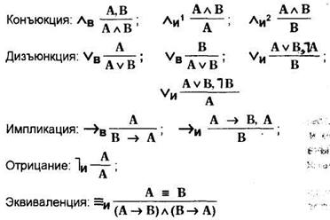 Правила СНВ позволяют оперировать со всеми связками, имеющимися в алфавите языка. Они делятся на правила введения (в) и правила исключения (и) связок.