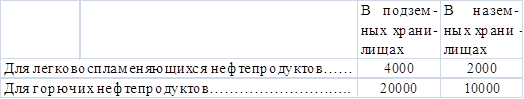 Одновременно с этим для нефтебаз, размещаемых на промышленных предприятиях, норма хранения ограничена и зависит от характера нефтепродукта и типа хранилища. Суммарный объем в резервуарах и зданиях (площадках) для хранения нефтепродуктов в таре на этих складах допускается в следующих количествах (в м3):