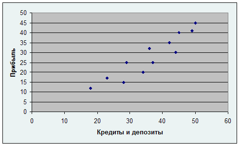 Из диаграммы рассеяния видно, что зависимость между прибылью банка и объемом межбанковских кредитов и депозитов носит линейный характер. Кроме того, исследуется зависимость прибыли банка только от одного фактора — объема межбанковских кредитов и депозитов, поэтому регрессию будем строить в виде
