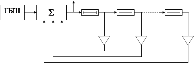 В задачах статистического моделирования часто возникает необходимость генерации случайного процесса с заданной корреляционной функцией или с заданной формой и характеристиками СПМ. Для этих целей эффективно использовать генератор процесса АР, показанный на рис. 2.