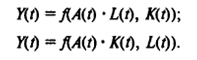 В результате строят двухфакторную ПФf(x1,x2), или Y=f(K, L). Далее от двухфакторных производственных функций переходят к трехфакторным, при этом в качестве третьего фактора иногда вводятся объемы используемых природных ресурсов. Кроме того, если производственные функции строятся по данным временных рядов, то в качестве особого фактора роста производства можно включить технический прогресс.
