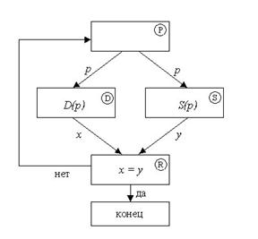 Информация о векторе p поступает в блоки D и S, в которых формируются соответственно множества D(p) и S(p), содержание которых, в свою очередь, передается в блок R. В блоке R осуществляется попарное сравнение элементов