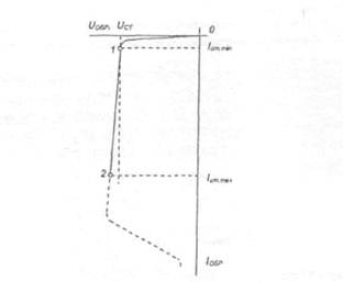 Точка 1 на характеристике соответствует минимальному току стабилитрона 1ст.min , при котором наступает пробой. Точке 2 соответствует максимальный ток стабилитрона Iст.max, достижение которого еще не грозит тепловым пробоем р- n- перехода. Iст.max ограничивается величиной максимальной мощности рассеяния Рmax.