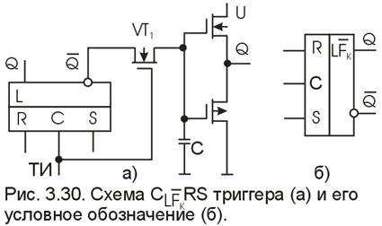 На рис. 3.30 показана обобщенная схема КТ на примере RS-триггера. Схема содержит следующие элементы: статический элемент памяти; схему формирования фазных импульсов (СФИ); коммутирующий транзистор (VT1); динамический элемент памяти в виде емкости «С» затвора выходного инвертора; выходной инвертор. Статический элемент памяти выполнен в виде