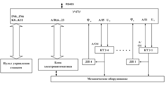 В качестве объекта управления выбрана система ЧПУ фрезерно-токарного станка с четырёхосевым приводом постоянного тока. На рисунке 1 представлена структурная схема подобной системы УЧПУ. На схеме приняты следующие обозначения: