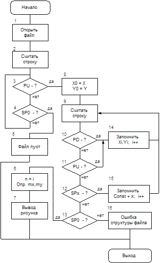 В случае появления символов PU продолжение строки содержит начальные координаты x и y изображения. Значения x и y переводятся из формата строки в формат long и запоминаются в промежуточном буфере УП. После этого начинается построчное преобразование абсолютных значений координат концов отрезков прямых в переменные типа long и запоминания их в промежуточном (блоки 8-13 алгоритма).