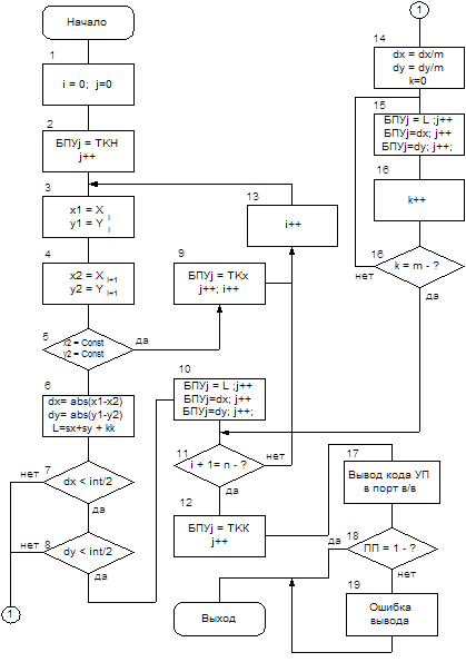 При превышении текущих значений приращений по координатам или одной из них величины порога отрезок разбивается на m участков, где m есть отношение максимально возможного приращения по координате заданного типа оборудования к величине int/2, и формируется ветвь алгоритма записи m участков прямой (блоки 14-16). После этого происходит переход к основной ветви алгоритма (блок 11).