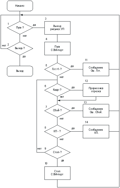 Блок-схема алгоритма запуска УП на исполнение с ЭВМ верхнего уровня представлена на рисунке 6. Данный режим работы оболочки связан с непосредственным управлением работой ЧПУ и не может быть покинут без передачи сообщения в систему. После входа в режим "Работа по программе" осуществляется опрос двух кнопок управления, выведенных на панель оболочки. Это кнопки "Пуск" и "Выход" (блоки 1 и 2 алгоритма). При нажатии кнопки "Выход" осуществляется переход в фоновый режим. При нажатии кнопки "Пуск" происходит вывод рисунка УП в графическое окно оболочки (блок 3 алгоритма), затем через com-порт передается команда запуска УП на отработку. Если система ЧПУ готова к работе в этом режиме, выдается сообщение о готовности и происходит запуск УП, т.е. начинается обработка детали. В случае, если система по той или иной причине не готова к работе, возвращается нулевой сигнал готовности, при этом на экран выводится сообщение о неготовности устройства к работе и осуществляется переход в начало (блоки 5, 11 алгоритма).