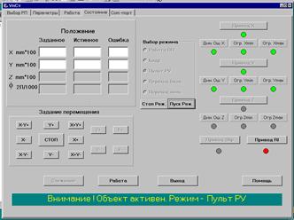 окна индикации заданного и истинного положения осей электроприводов X, Y, Z, φ, а также величины рассогласования (на рисунке 6 показан режим управления двухосевым приводом, поэтому окна Z и φ не активны);