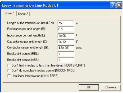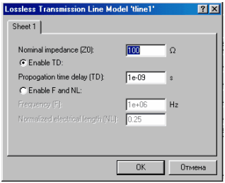 В окне, изображенном на рис. 2, задаются значения параметров эквивалентной схемы (рис.1,в), где, кроме перечисленных выше параметров, указаны длина ЛС (LEN , м). В диалоговом окне для идеальной ЛС (R = 0, G = 0) (рис. 3) обозначено: ZO -волновое сопротивление, Ом; TD — время задержки распространения сигнала. Процессы, происходящие в ЛС, описываются так называемыми телеграфными уравнениями (51):