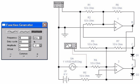 Схема и настройки функционального генератора содержит сумматор на ОУ 1 и сумматор-выпрямитель на ОУ 2; в качестве несущей используется однополярная (положительной полярности) последовательность прямоугольных импульсов с параметрами, определяемыми настройками функционального генератора (см. рис. 3, б). Напряжение на выходе сумматора-выпрямителя (т. А на осциллограмме рис.4)