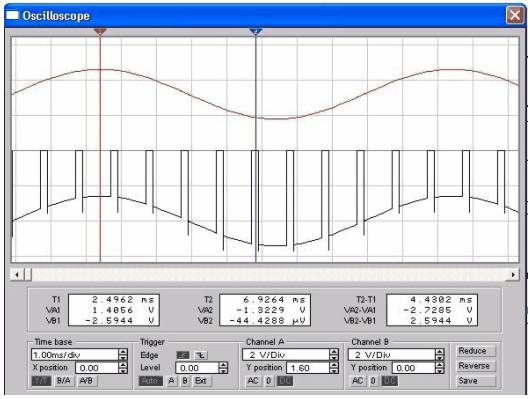 В процессе моделирования можно наблюдать, что после его запуска входной ток постепенно (по синусоиде и в зависимости от быстродействия ПК) возрастает, в то время как выходной ток остается нулевым до тех пор, пока волна (верхняя осциллограмма) не достигнет конца линии
