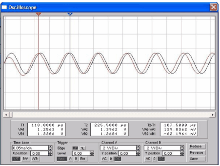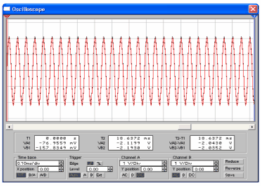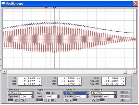 Сигнал с выхода колебательного контура измеряется осциллографом и подается на вход амплитудного детектора, формирующего модулирующее (низкочастотное) колебание, которое также можно наблюдать на экране (Рис.10) осциллографа по каналу В.