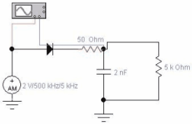 Наиболее простой схемой амплитудного детектора АД является схема, изображенная на рис.8, с полупроводниковым диодом D и фильтром на элементах R1 и С. Входным сигналом служит сигнал с источника амплитудномодулированных колебаний АM, нагрузка имитируется резистором R2. Осциллограмма выходного сигнала, полученного на нагрузке R2, представлена на рис.8.
